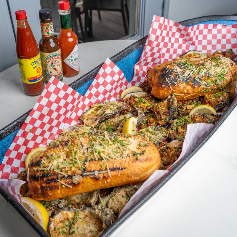 Garlic-buttered pistolette, spinach-artichoke spread, fried oysters, parmesan.